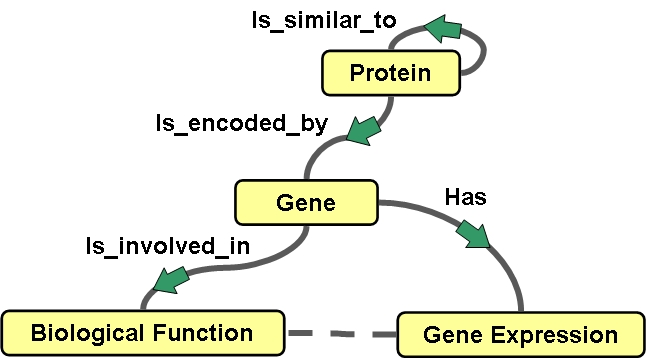According to the Service Mart modeling approach of Search Computing (Ceri et al., 2010), we selected an initial set of typical biomolecular topics (i.e. Protein, Gene, Gene Expression and Biological Function) and modeled the Service Marts (i.e. the generalized and normalized conceptual description) of the bioinformatics services that provide data regarding such topics. We did so by identifying their main and common attributes and normalizing their names. We also defined the semantic Connection Patterns, i.e. the pair-wise coupling, between Service Marts of services that provide data about different topics. This was done by identifying pairs of normalized attributes of the connected Service Marts and defining their comparison predicates, as conjunctive Boolean expressions, that allow joining their values semantically. In so doing, we defined the Semantic Resource Framework (SRF) depicted in Figure 1, which constitutes the reference used by Search Computing to enable the exploration of the services registered in the framework and integrate the data that they provide (Ceri et al., 2010).